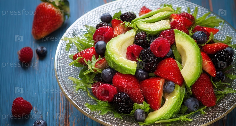 Фруктовый салат с авокадо, клубникой, малиной, ежевикой, черникой на аругуле в текстурированной стеклянной чаше, деревенской голубой древесиной, разбросанными ягодами
