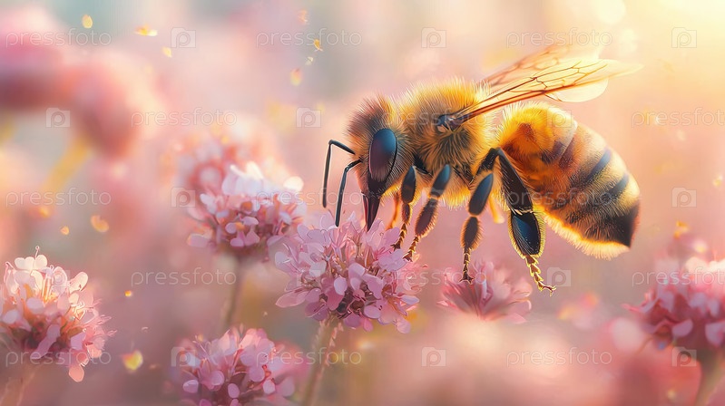 Закройте медоносную пчелу, желтые/черные полосы, нечеткие, прозрачные крылья, собирает пыльцу с розовых цветов под часовым солнцем. Мягкий боке, плавающая пыльца, безмятежная естественная сцена. копать