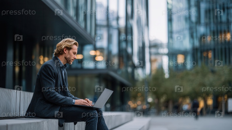 Бизнесмен печатает на ноутбуке на открытом воздухе