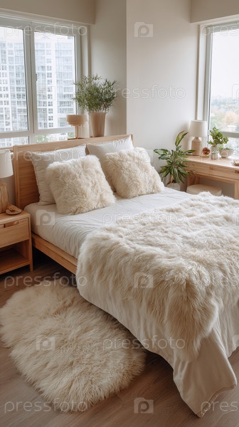 Минималистическая спальня деревянная кровать, белая, меховые подушки / бросок, соответствующие тумбочки и лампы. Вид на город через большие окна. Легкий деревянный меховой коврик. Естественный свет подчеркивает мягкую текстуру