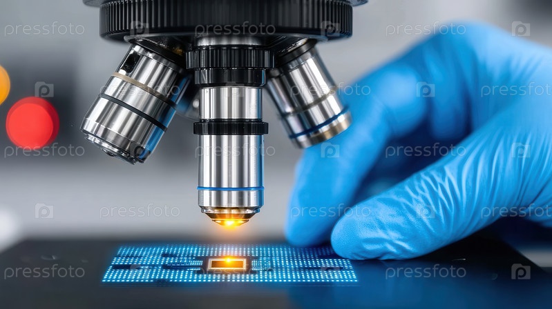 Закройте перчаточную руку, держащую чип под микроскопом со светящимся оранжевым светом, освещающим схему, установленную на размытом лабораторном фоне с боке