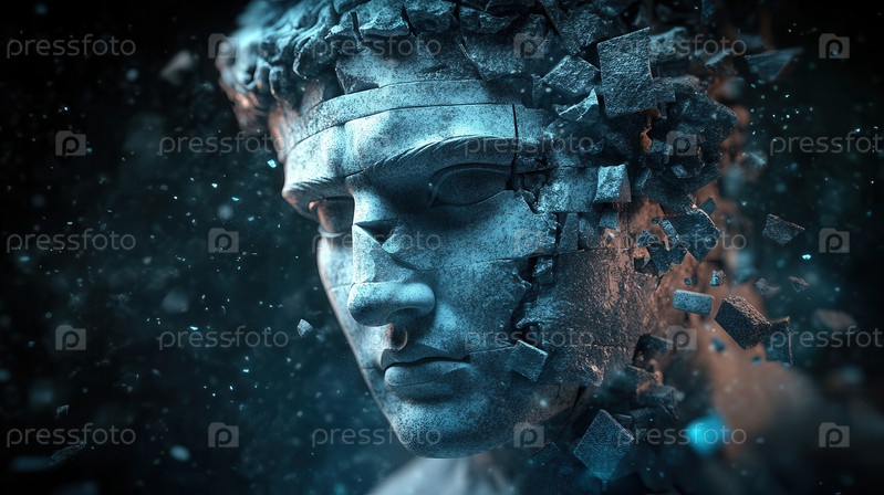 Фрагментированная классическая мраморная голова статуи растворяется в плавающих обломках на темном космическом фоне, освещенном прохладным синим и теплым оранжевым окружающим светом, передавая распад и трансформацию