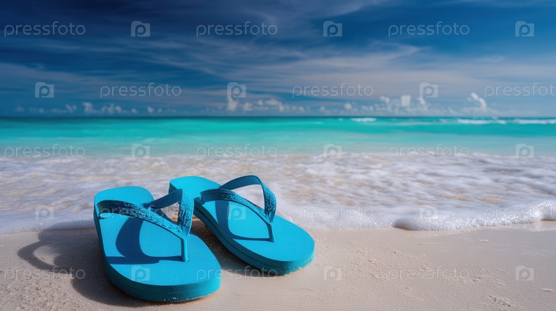 Голубые шлепанцы на песчаном пляже с океанскими волнами