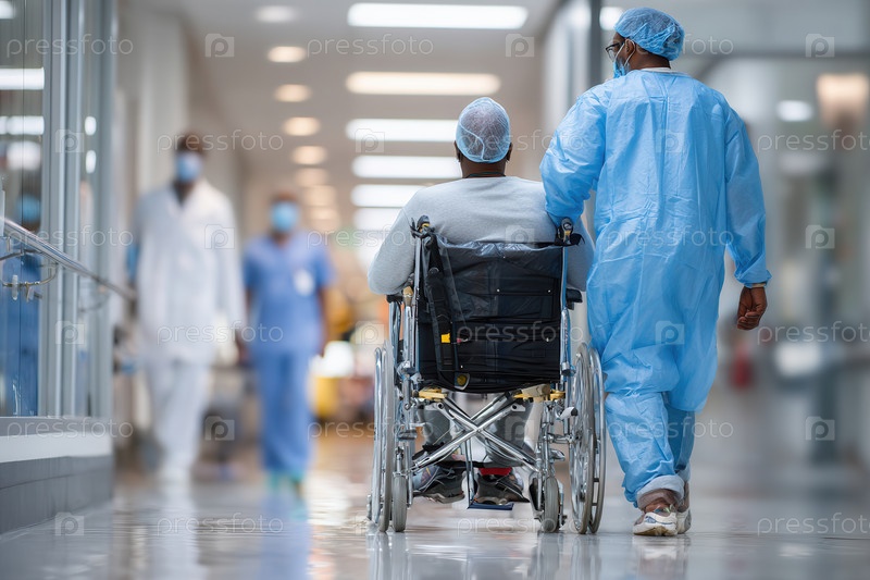 Медицинский персонал толкает пациента в инвалидном кресле по коридору больницы