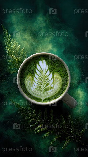 Керамическая кружка с яркой зеленой маткой, искусство белого листа, свежие веточки, дымчатая зеленая бг. Капли росы, туман, золотые пятна. Студийное освещение подчеркивает текстуру и глубину