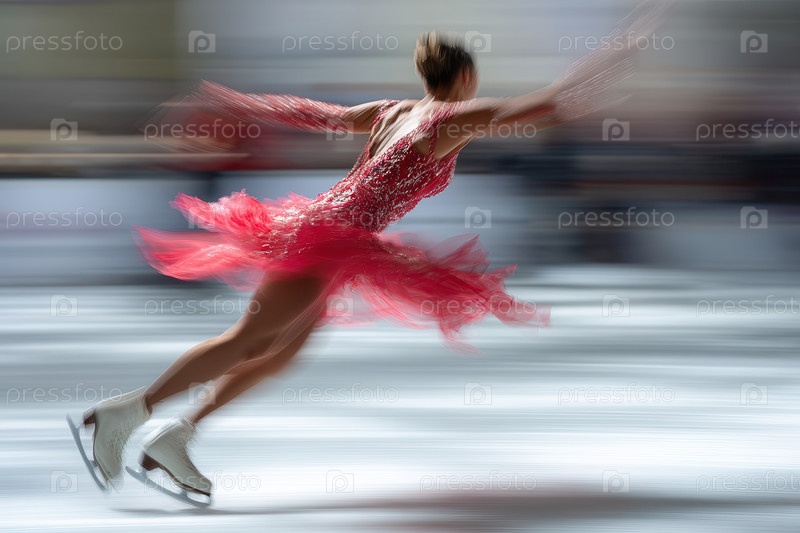 Самка фигуристки в красном блестящем платье динамично скользит по льду, вытягивает руки, движение размывается, показывая скорость. Белые коньки контрастируют с отражающим льдом. Размытые зрители на внутренней арене. Неглубокая глубина филя