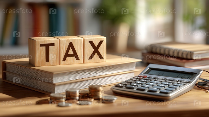 Деревянные блоки написания TAX на сложенных книгах на деревянном столе в сопровождении калькулятора, разбросанных монет и размытого фона книжной полки и окна. Профессиональный, сухой тон