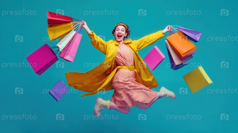 Энергичная молодая женщина в желтом плаще и клетчатом платье радостно прыгает против телячьего болота, руки протянуты, держа сумки для покупок, передавая восторг и успех в розничной торговле