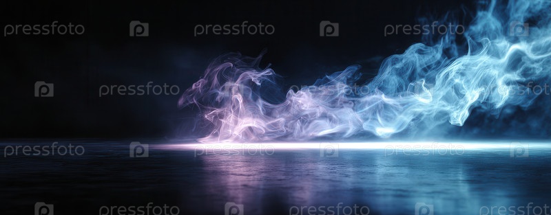 Синий/фиолетовый дым течет по темной отражающей поверхности, зеркальным бликам. Низкоугольный выстрел, эфирное движение против черной пустоты. Искусственное освещение светящиеся края, глубокие тени. Футуристический, мой
