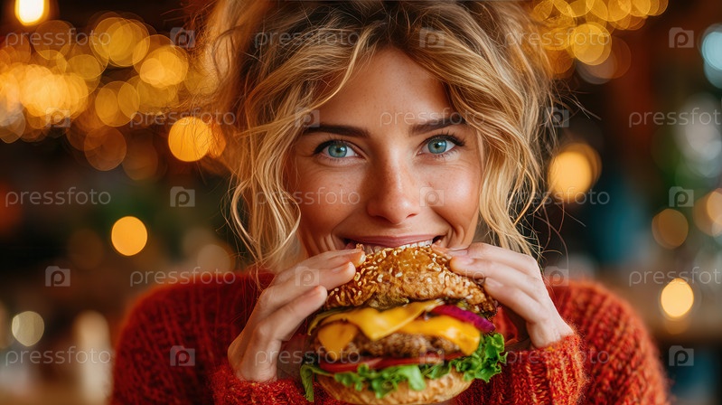 Женщина кусает гамбургер с боке-светом
