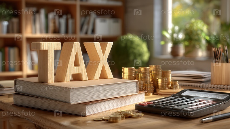 Деревянный TAX блокирует книги на столе, с золотыми монетами, черным калькулятором и размытыми книжными полками и окнами. Теплый свет подчеркивает профессиональную финансовую тему