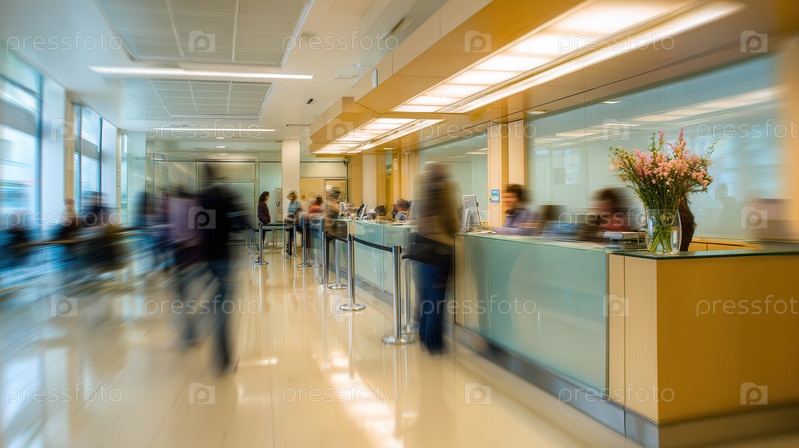 Размытые фигуры перемещаются через яркие современные стеклянные счетчики банковского лобби, полированные полы, персонал за столами, розовые цветы, добавляющие тепло