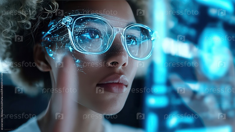 Молодая женщина с вьющимися волосами, в футуристических прозрачных очках, показывающих голубые голографические данные, жестикулирует пальцем. Blurred blue tech bg. Профессиональная, высокотехнологичная атмосфера