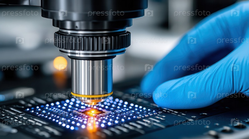Возлюбленная рука держит печатную плату под микроскопом ярко-оранжевое лазерное пятно выделяет микрокомпоненты. Светящиеся синие точки предполагают активное тестирование. Чистая лабораторная обстановка, неглубокая глубина резкости подчеркивает p
