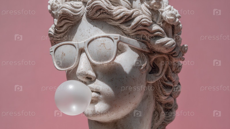 Выветренный мраморный бюст классической фигуры с волнистыми волосами, одетый в белые рамные солнцезащитные очки, выдувающий пузырь жвачки, против сплошного розового. Показаны следы старения. Сюрреалистическая смесь древних