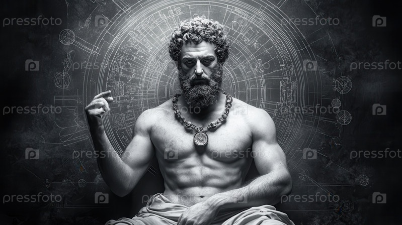 Мышечный бородатый мужчина в халатах, жестикулирующий на астрологической диаграмме., драматическое освещение. Дизайнерский рендер, нет