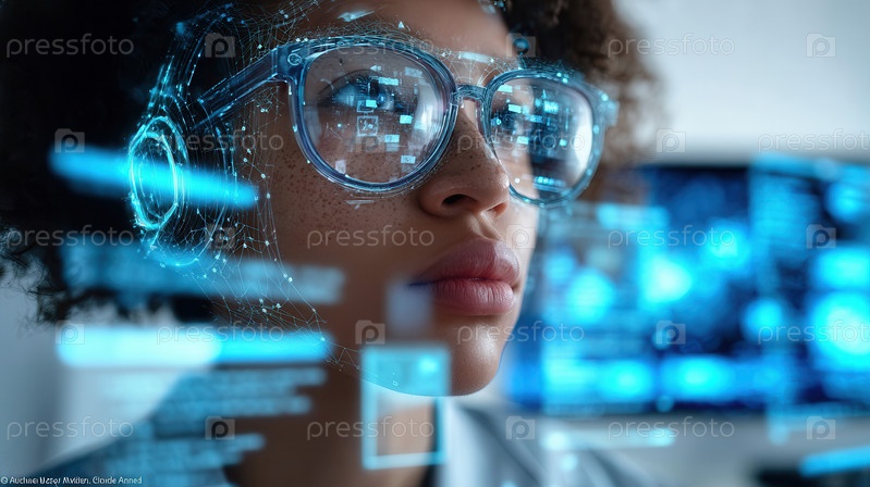 Закройте молодую чернокожую женщину с вьющимися волосами, веснушками, в очках AR, показывающих светящиеся синие интерфейсы. Голографические данные плавают вокруг нее. Размытая техническая лаборатория с синими экранами на заднем плане. Ку-ку