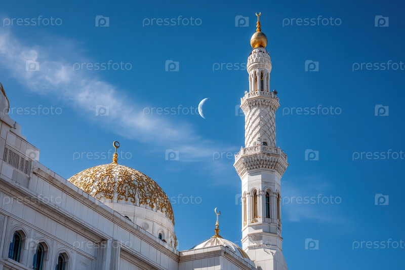 Белый минарет и купол на фоне голубого неба с шикарными облаками и луной. Солнечный свет блестит золотыми и каменными текстурами. Подчеркивает вертикаль и симметрию