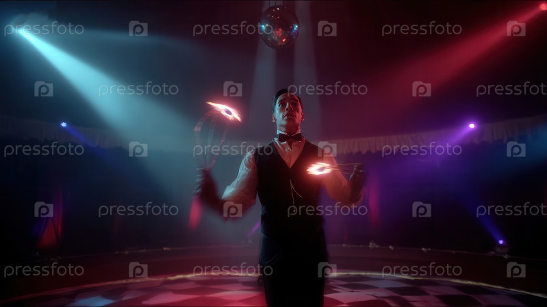 Мужчина-исполнитель в формальном жилете и боути жонглирует пылающими факелами под драматическими сценическими огнями, с дискотечным шаром, висящим над и клетчатым полом под ним, в затемненной обстановке цирковой палатки