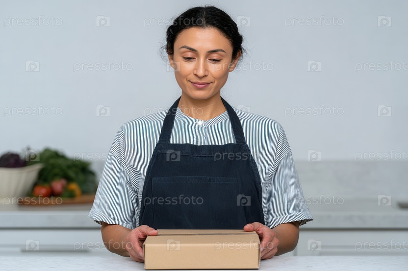 Женщина , темные волосы, завязанные назад, полосатая рубашка, темный фартук, держит коричневый картонный пакет на белом счетчике. Размытая кухня, овощи в БГ. Мягкое освещение. Спокойно, профессионал