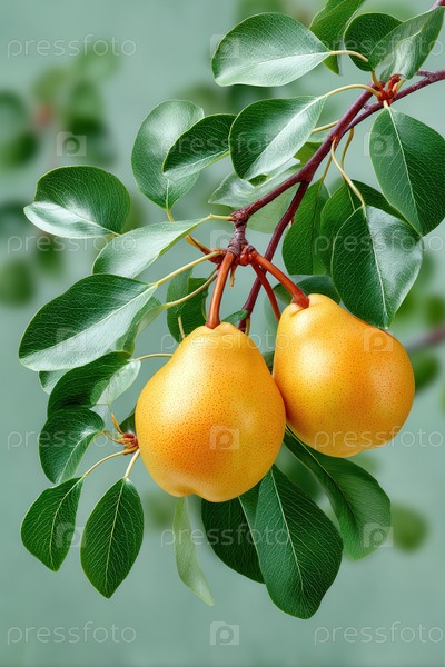 Спелые груши, висящие на ветке с зелеными листьями