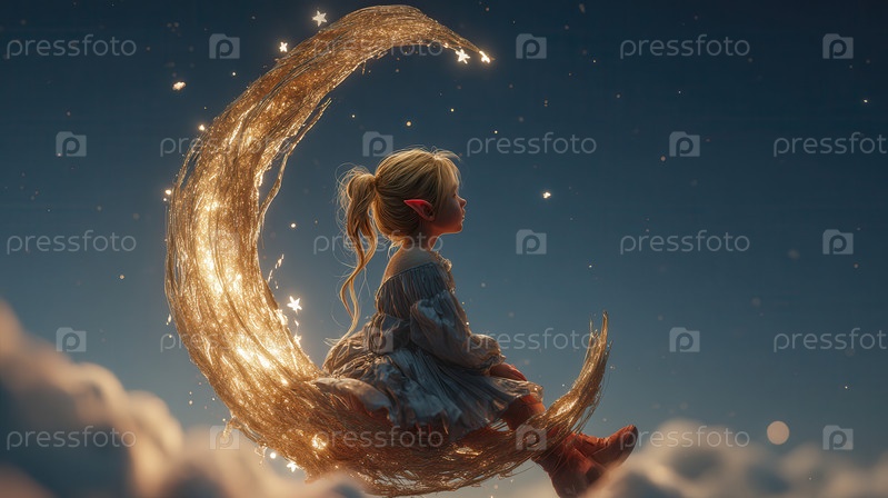 Ребенок с эльфийскими ушами сидит на светящейся луне