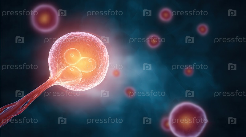 Сперматозоид проникает в светящееся яйцо с видимыми ядрами, окруженными размытыми красно-оранжевыми клетками против темно-синего. Цифровая иллюстрация клеточной биологии в деталях