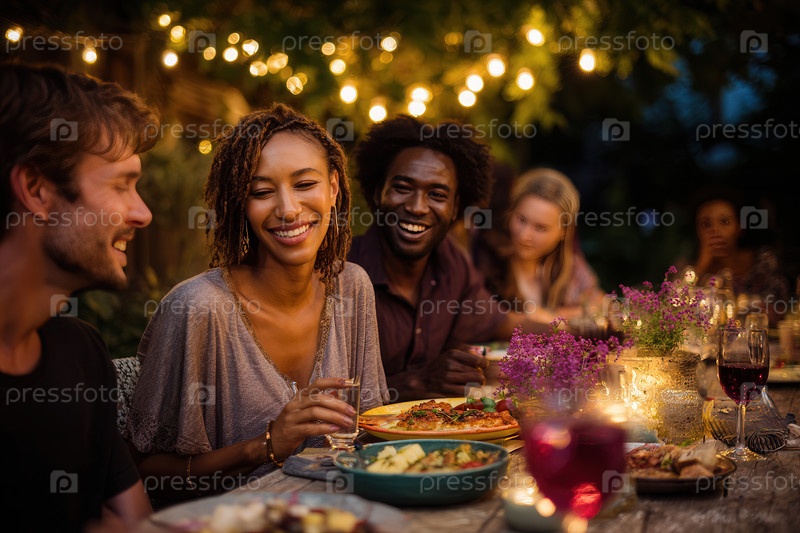 Друзья смеются над ужином на открытом воздухе