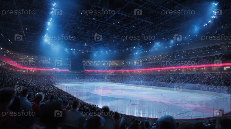 Крытая хоккейная арена, яркие синие прожекторы, красные неоновые полосы, размытая толпа, высокий потолок с балками, профессиональная спортивная атмосфера