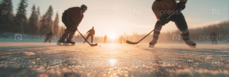 Хоккеисты соревнуются на замерзшем озере на закате
