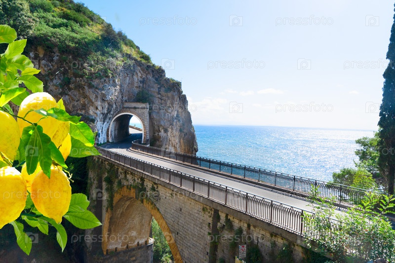 Знаменитая живописная извилистая дорога побережья Амальфи, лето с цветами, Италия