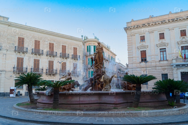 Старая средневековая городская улица Сиракуз с фонтаном Дианы, Сицилия Италия