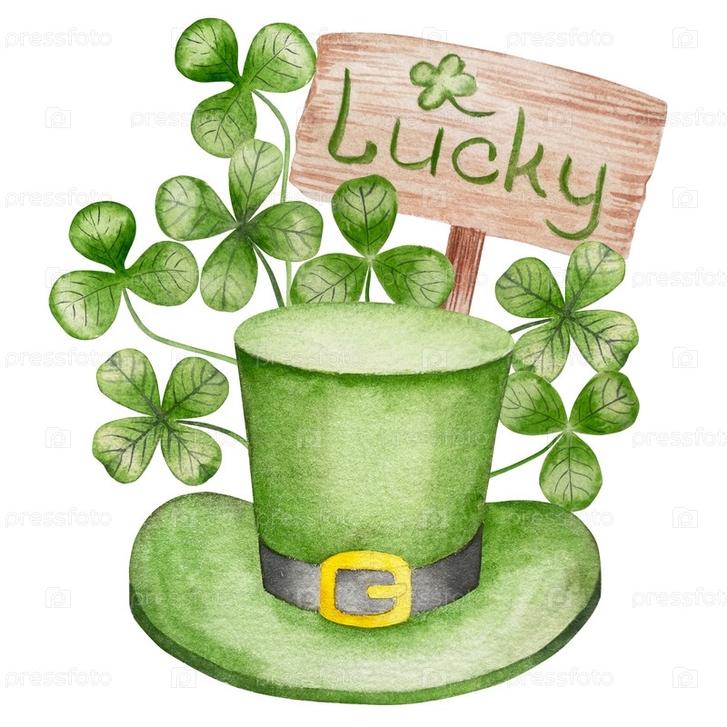 Набор акварельных иллюстраций ко Дню Святого Патрика. Рука нарисована изолированным клипартом с шапкой лепрекона, клеверами, золотыми монетами, ирландским флагом, зеленым пивом и горшком золота. Талисманы для удачи, богатства или успеха. Коллекция предмет
