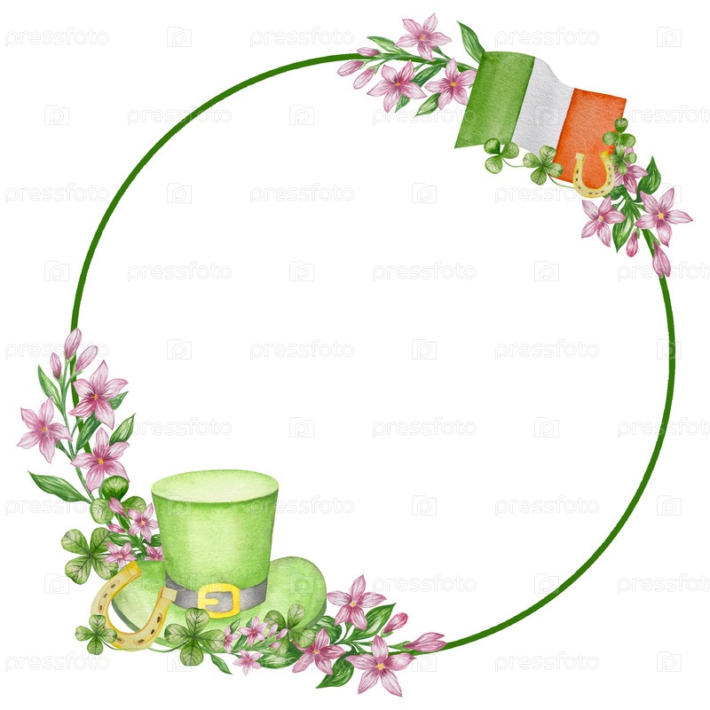 Набор акварельных иллюстраций ко Дню Святого Патрика. Рука нарисована изолированным клипартом с шапкой лепрекона, клеверами, золотыми монетами, ирландским флагом, зеленым пивом и горшком золота. Талисманы для удачи, богатства или успеха. Коллекция предмет