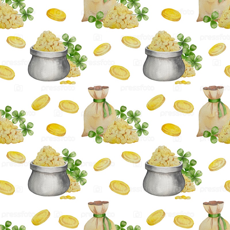 Набор акварельных иллюстраций ко Дню Святого Патрика. Рука нарисована изолированным клипартом с шапкой лепрекона, клеверами, золотыми монетами, ирландским флагом, зеленым пивом и горшком золота. Талисманы для удачи, богатства или успеха. Коллекция предмет