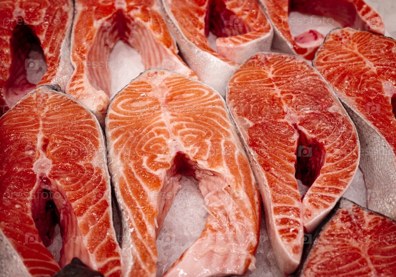 Свежие сырые стейки из лосося на дисплее, ярко-оранжевое мясо рыбы с мраморной текстурой и кожей, готовое к приготовлению, фон рынка морепродуктов