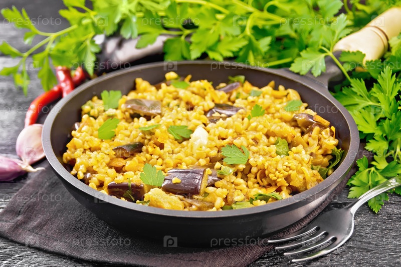 Булгур с баклажаном в сковороде на доске