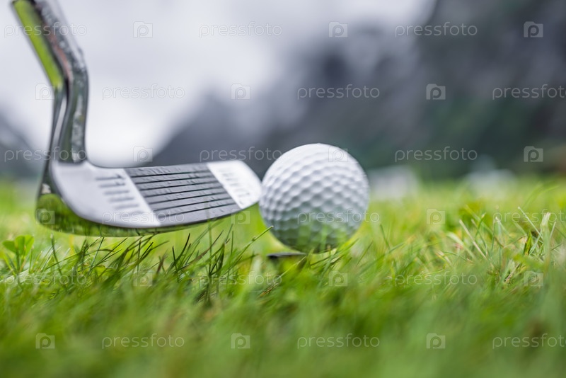 Гольф-клуб и мяч на мокром зеленом поле с горами на заднем плане