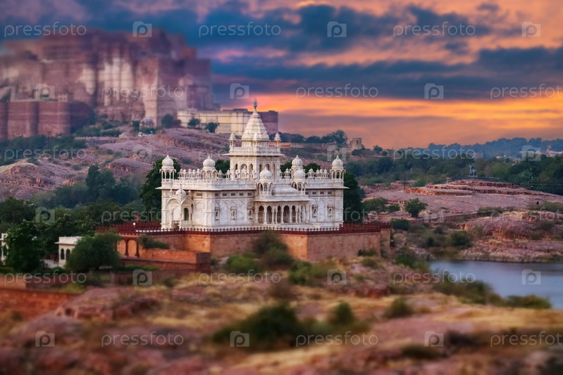 Живописный вид на белый мрамор Jaswant Thada cenotaph в Джодхпуре, Раджастхан, в окружении скалистых холмов и спокойного озера на закате