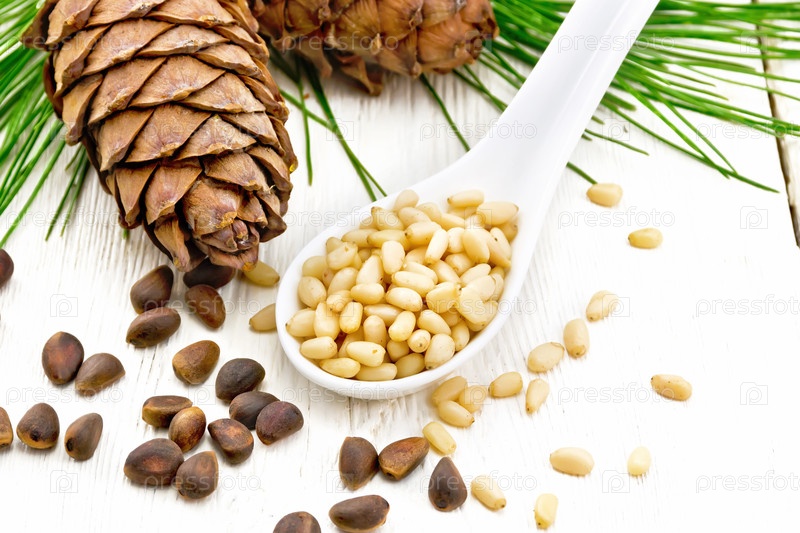 Кедровые орехи чищенные в ложке на светлой доске