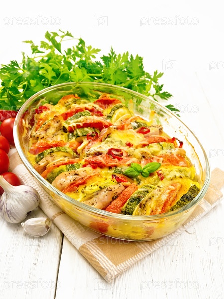 Запеканка с куриной грудкой и овощами в жаровне на белой деревянной доске