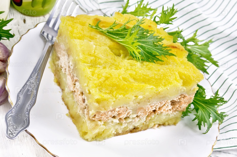 Запеканка с картофелем и рыбой в тарелке на светлой деревянной доске