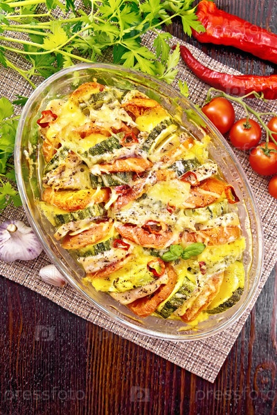 Запеканка с куриной грудкой и овощами в жаровне на столе сверху