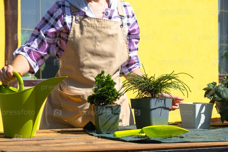 Женщина-флористка в фартуке пересаживает наружные хвойные можжевельники для озеленения
