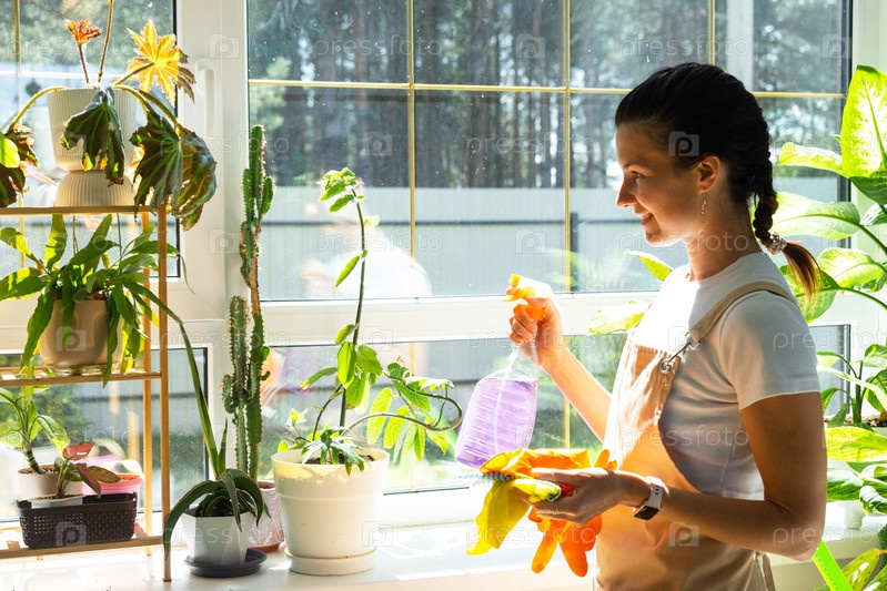 Женщина Портрет в резиновых перчатках и фартуке вручную моет окно дома тряпкой и шваброй внутри интерьера с домашними растениями. Восстановление порядка и чистоты весной, уборка сервиза