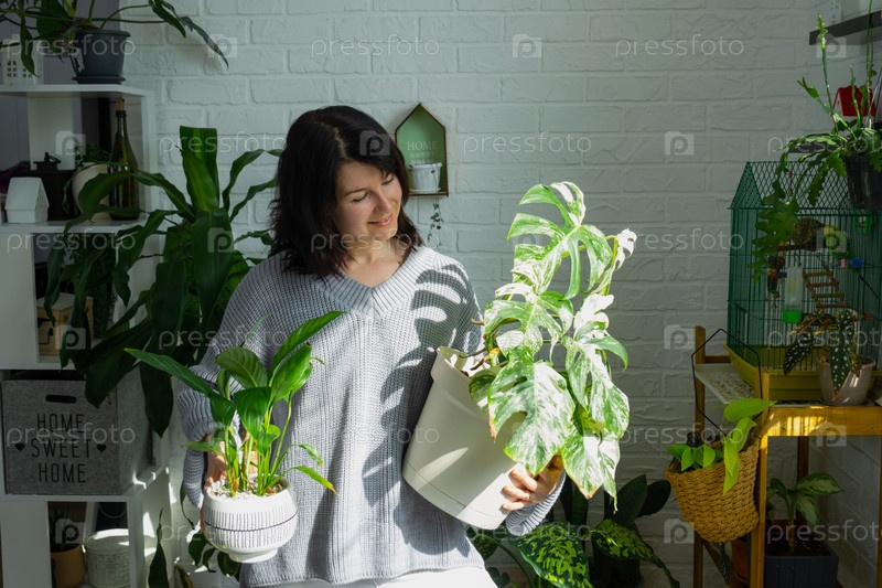 Женщина держит дома растение редкого варегатного монстра Альба в горшке в домашнем интерьере
