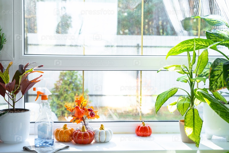 Тыквенный декор и оконные чистящие средства лежат на подоконнике с тряпкой, распыляют внутри интерьера с домашними растениями на подоконнике. Восстановление порядка и чистоты осенью, уборка сервиза