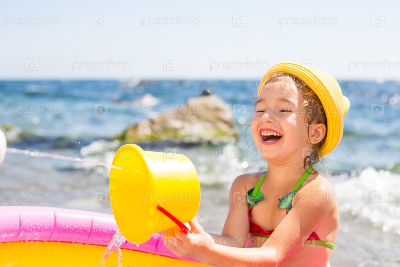 Девушка в желтой соломенной шляпе играет с ветром, водой и водораспределителем в надувном бассейне на пляже. Нестираемые продукты для защиты детской кожи от солнца, солнечных ожогов. курорт на море