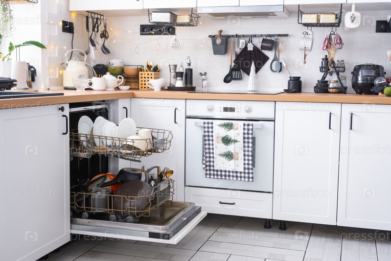 Много грязной посуды в посудомоечной машине на праздничной кухне. Помощь хозяйке, экономике и экологии. Уборка на кухне к праздникам Рождества и Нового года, после застолья и гостей