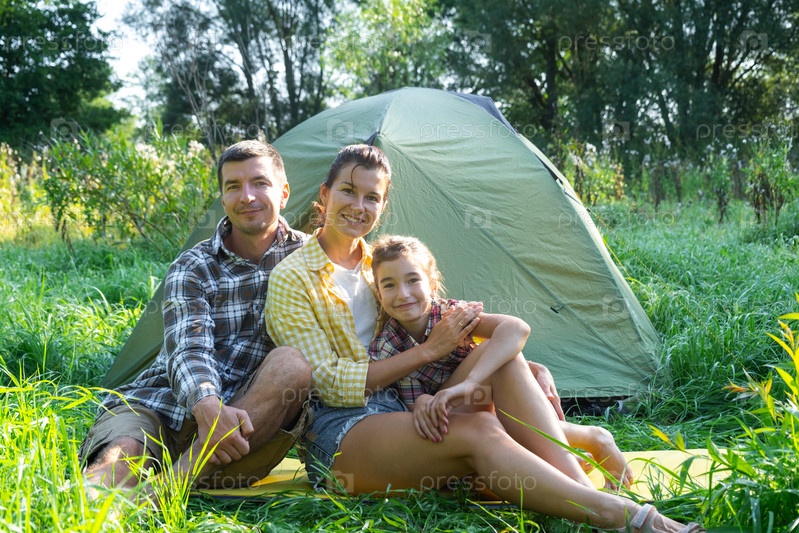 Портрет счастливой семьи, сидящей утром возле палатки для кемпинга на открытом воздухе, кемпинг, семейная походная поездка